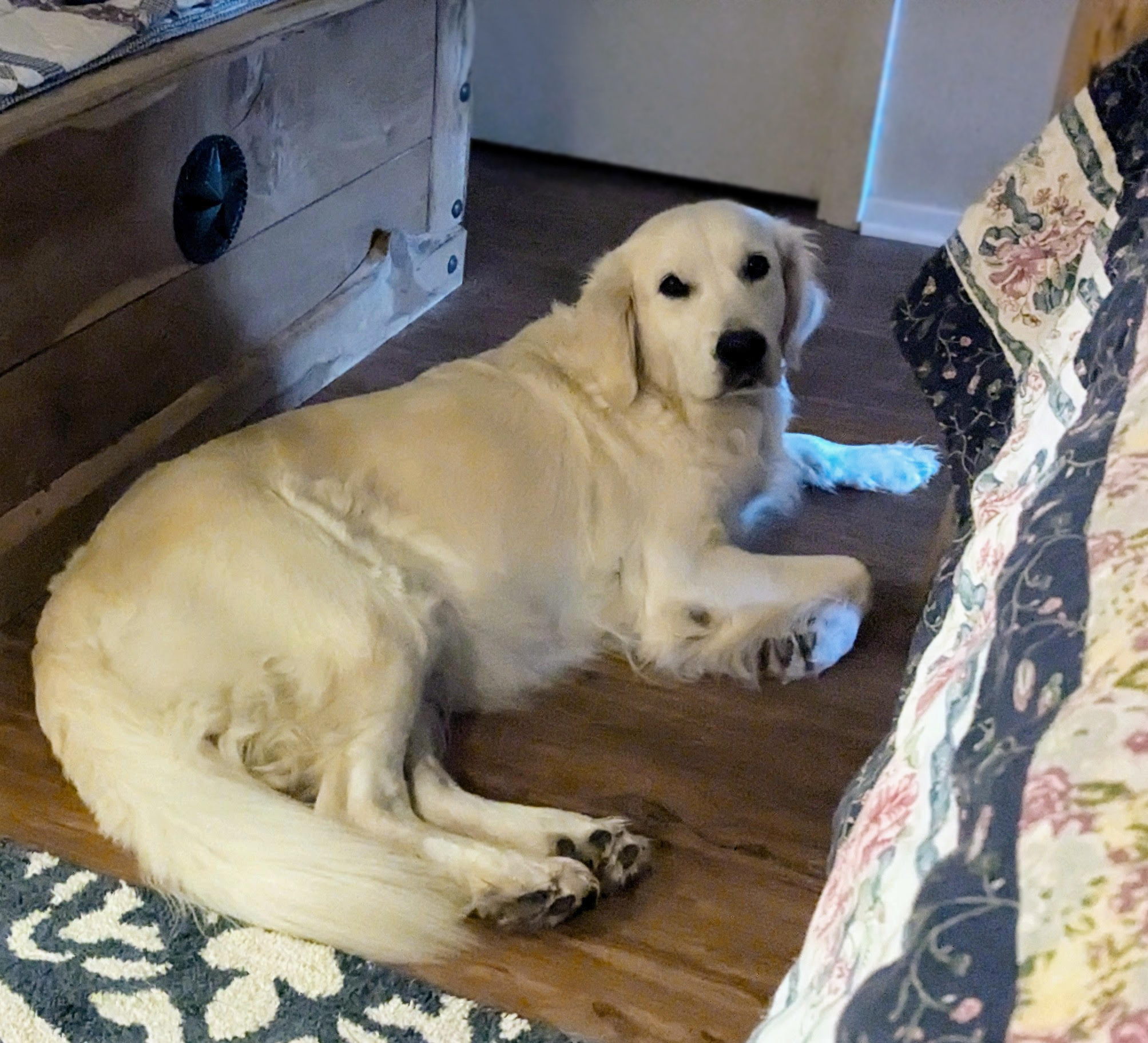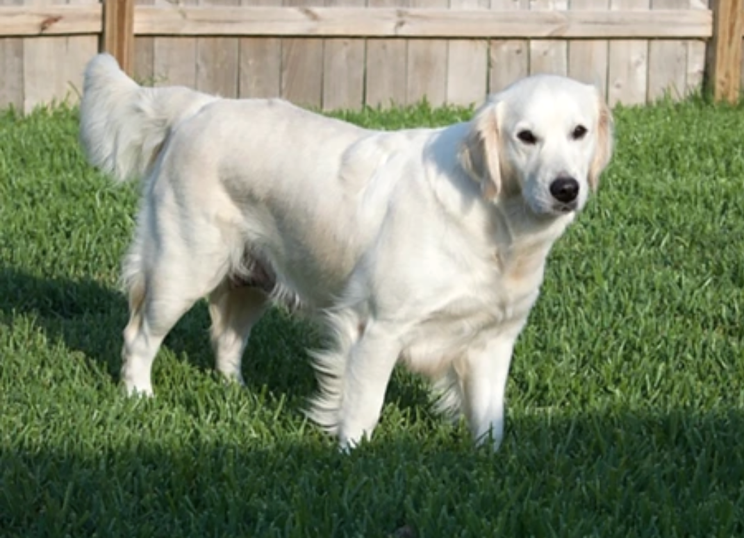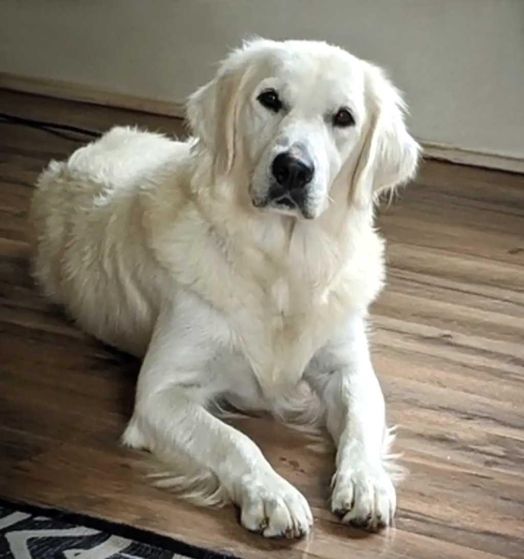 Marlos nickname is Sunshine! She is always smiling and happy, her tail never stops wagging. She is very tuned in to us, has strong eye contact and desire to please. This sweet girl is beautiful, with a silky white coat, twinkly dark eyes and good pigment. She is always ready for anything, walks, car rides, playtime. And if a door gets left open, she is off to the pond!